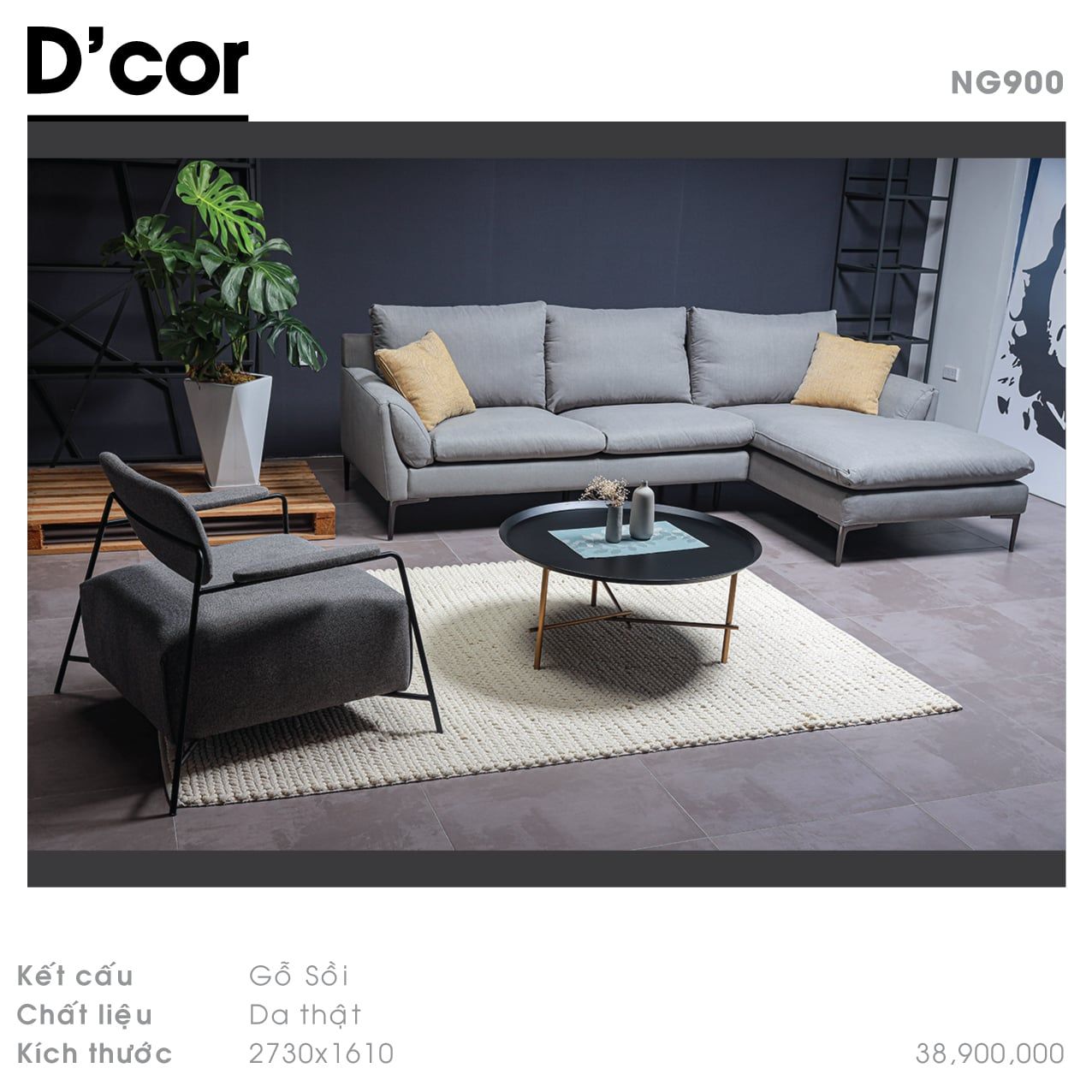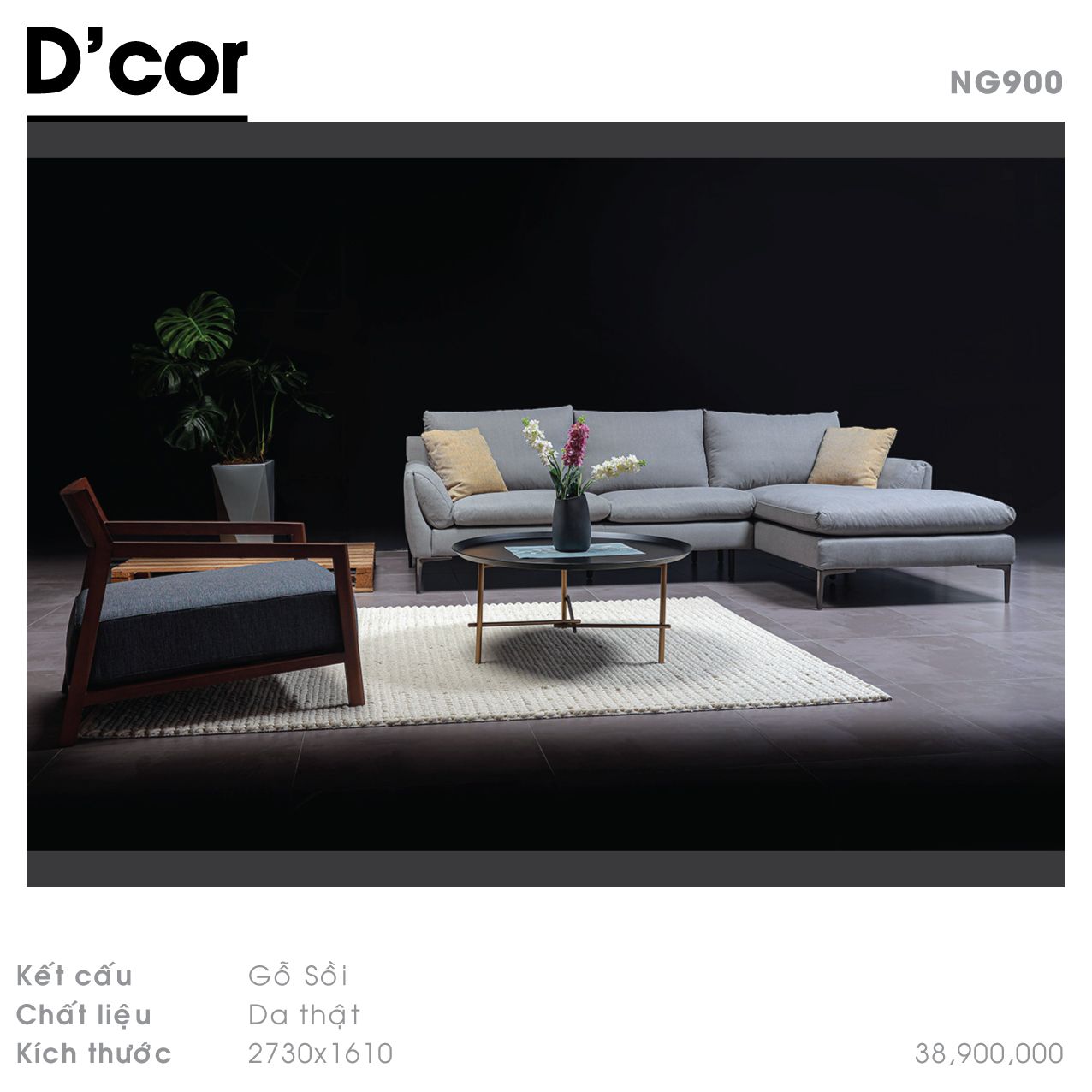 NG900 KUKA - Sofa nỉ góc gỗ sồi, nhập khẩu