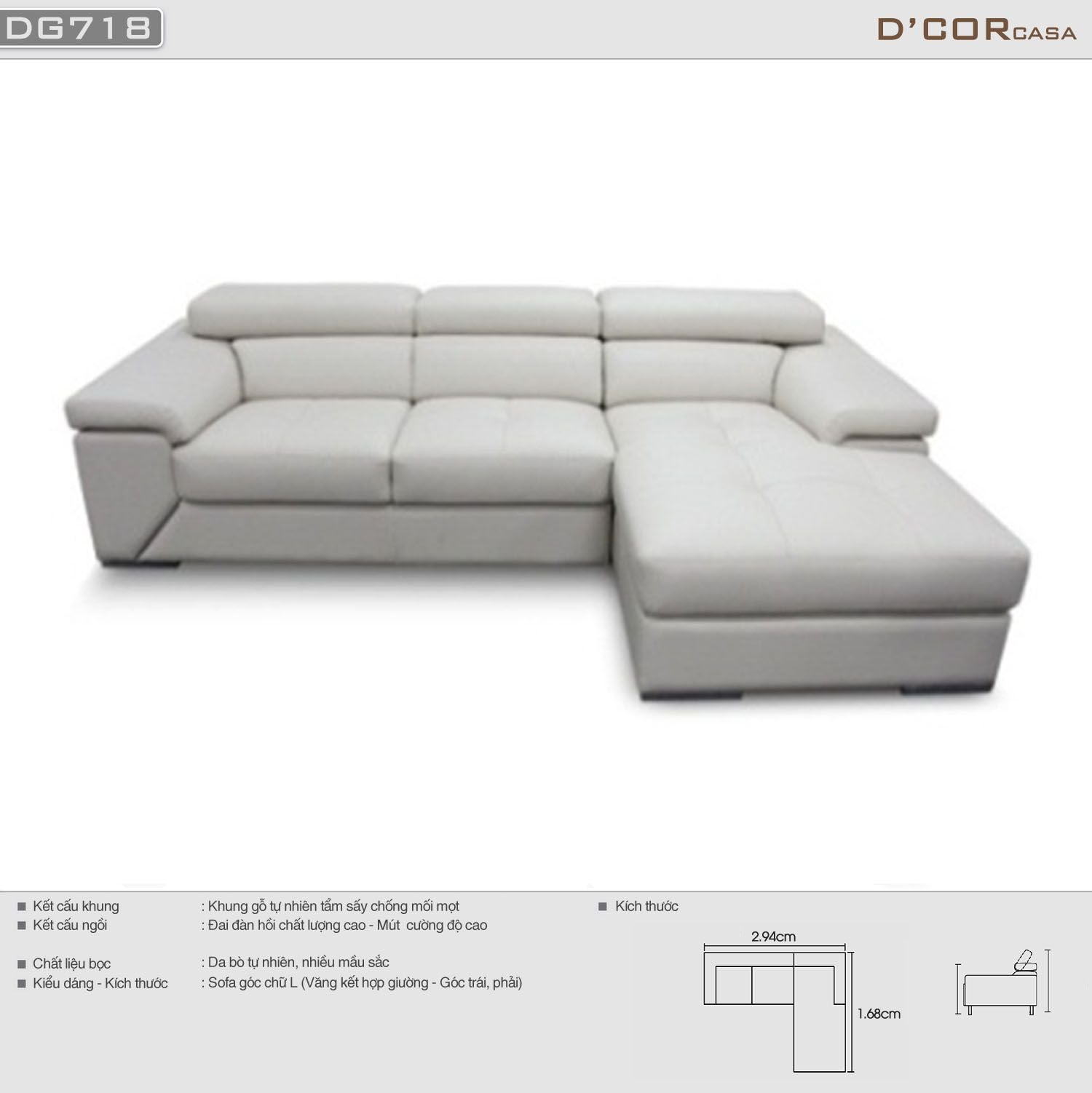 Với kích thước thước tiêu chuẩn: 2,94m x 1,68m được tính toán kỹ lưỡng, DG718 tỏ ra vô cùng ăn ý với mọi không gian của người Việt. Từ độ cao của ghế, chiều sâu lòng ngồi cho đến các chi tiết độ nghiêng của ghế đều hoàn hảo. Khiến người ngồi cảm thấy dễ chịu và thoải mái nhất.